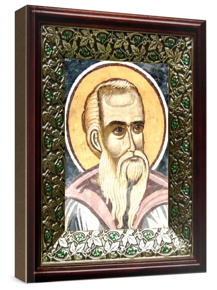 Икона пахомий великий (21х24), киот со стразами. Лик нанесен методом шелкографии на цельную липовую доску, покрытую левкасом (специальным грунтом под живопись). Использованы минеральные (природные) краски. Размер иконы без киота (см): 13х16, с киотом: 21х24. Киот со стеклом, выполнен из березы и украшен басмой со стразами (узор из черненой меди в виде лозы). Икона освящена.