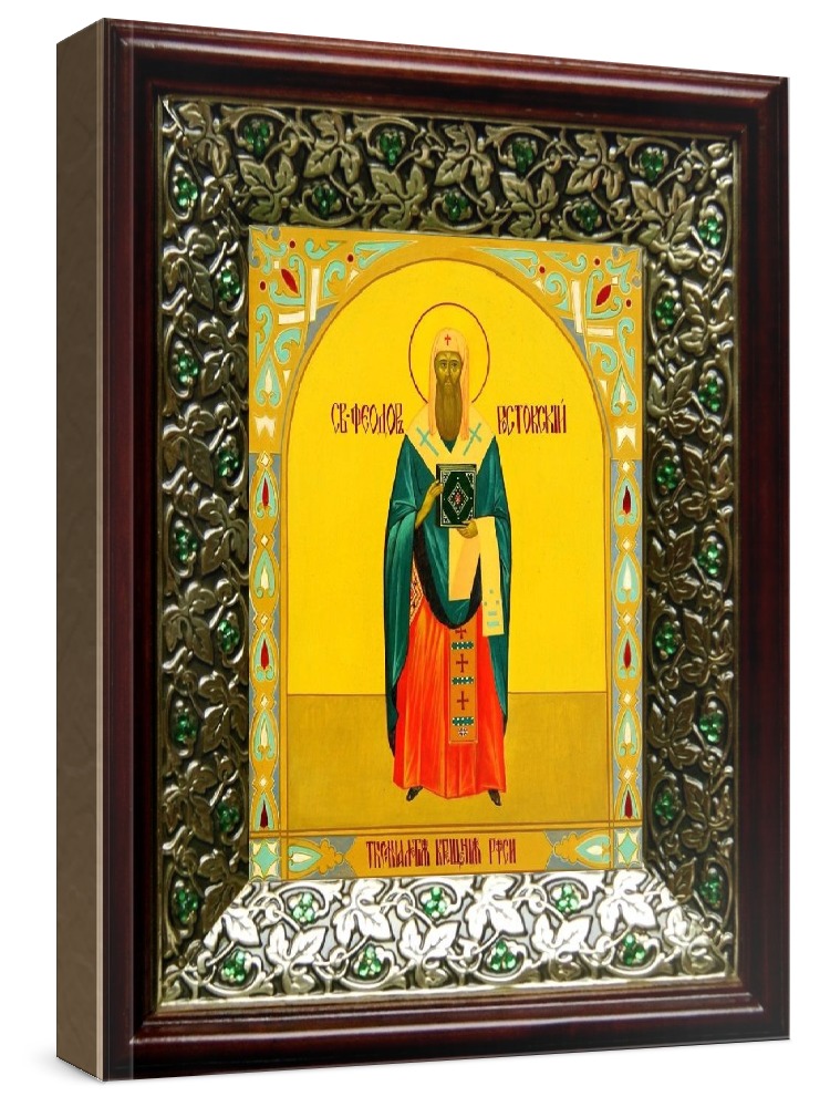 Икона феодор ростовский (21х24), киот со стразами. Лик нанесен методом шелкографии на цельную липовую доску, покрытую левкасом (специальным грунтом под живопись). Использованы минеральные (природные) краски. Размер иконы без киота (см): 13х16, с киотом: 21х24. Киот со стеклом, выполнен из березы и украшен басмой со стразами (узор из черненой меди в виде лозы). Икона освящена.
