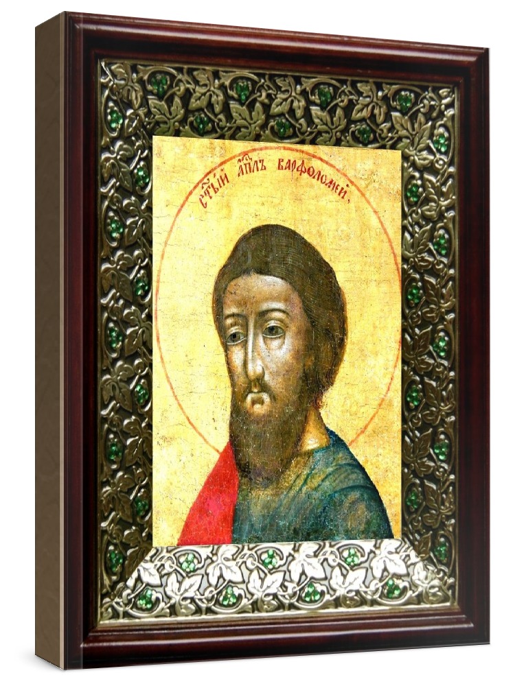 Икона апостол варфоломей (21х24), киот со стразами. Лик нанесен методом шелкографии на цельную липовую доску, покрытую левкасом (специальным грунтом под живопись). Использованы минеральные (природные) краски. Размер иконы без киота (см): 13х16, с киотом: 21х24. Киот со стеклом, выполнен из березы и украшен басмой со стразами (узор из черненой меди в виде лозы). Икона освящена.