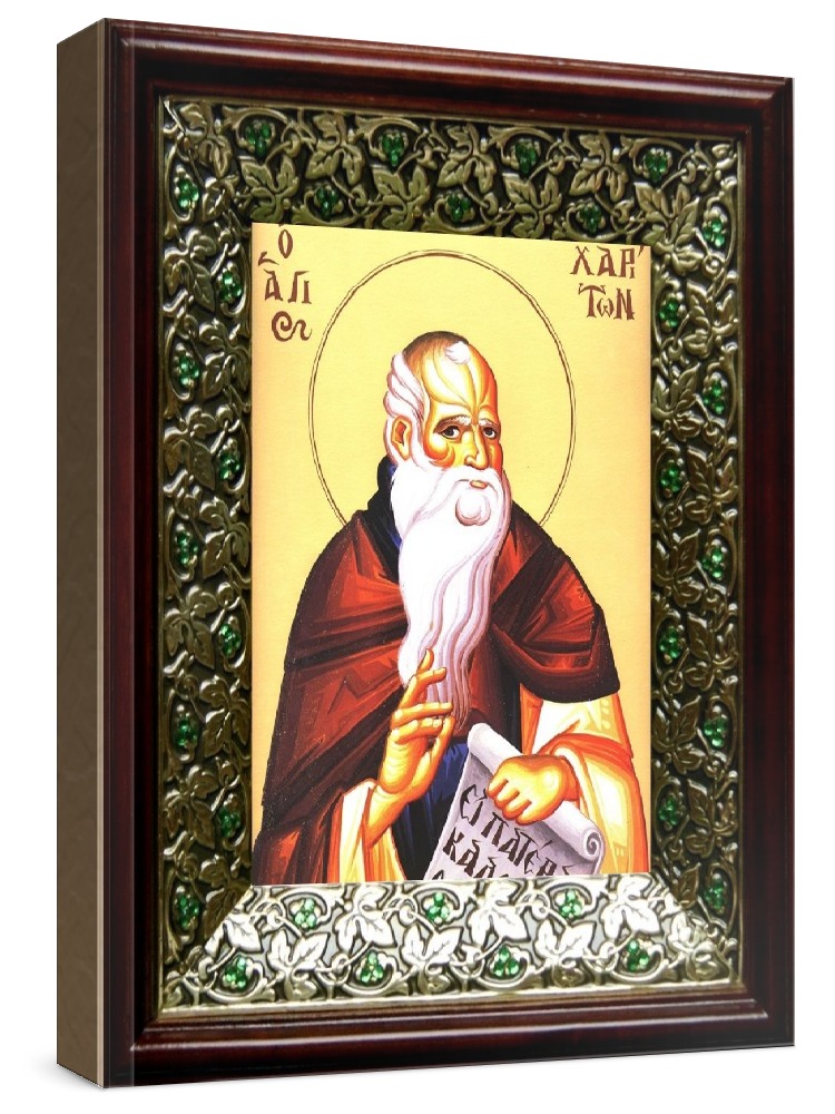 Икона харитон исповедник (21х24), киот со стразами. Лик нанесен методом шелкографии на цельную липовую доску, покрытую левкасом (специальным грунтом под живопись). Использованы минеральные (природные) краски. Размер иконы без киота (см): 13х16, с киотом: 21х24. Киот со стеклом, выполнен из березы и украшен басмой со стразами (узор из черненой меди в виде лозы). Икона освящена.
