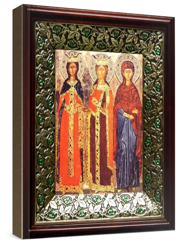 Икона екатерина и варвара (21х24), киот со стразами. Лик нанесен методом шелкографии на цельную липовую доску, покрытую левкасом (специальным грунтом под живопись). Использованы минеральные (природные) краски. Размер иконы без киота (см): 13х16, с киотом: 21х24. Киот со стеклом, выполнен из березы и украшен басмой со стразами (узор из черненой меди в виде лозы). Икона освящена.