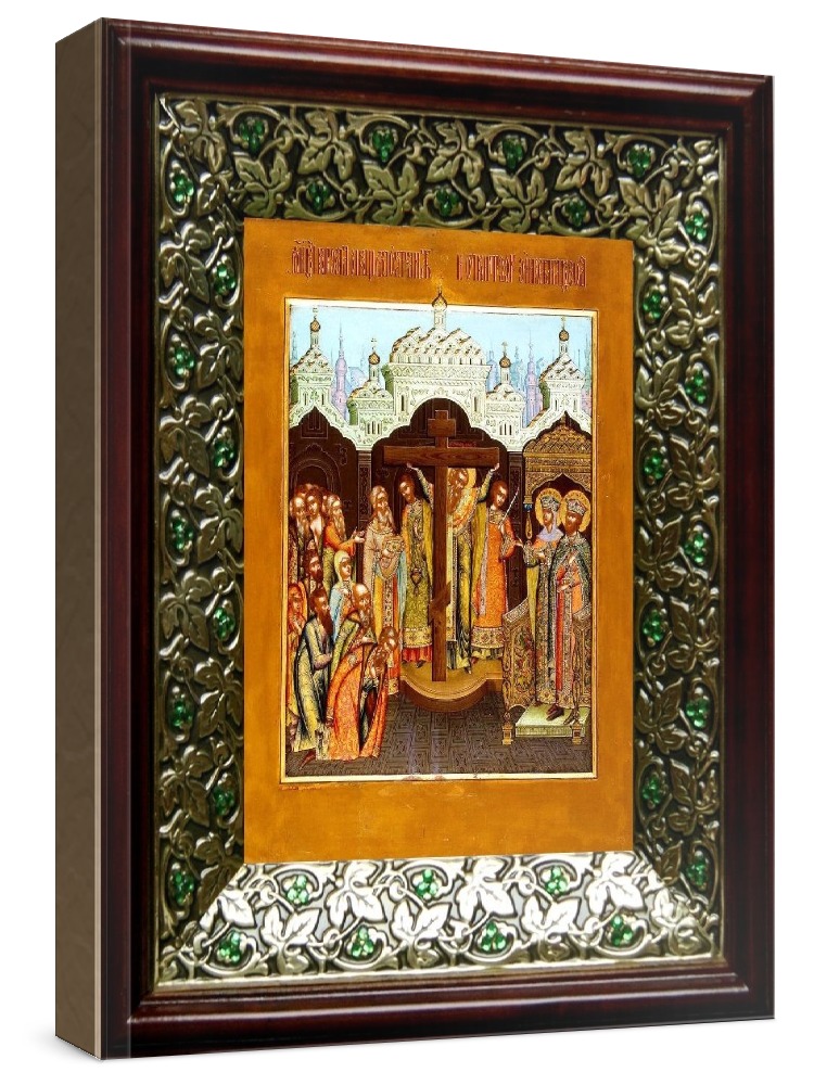 Икона воздвижение креста господня (21х24), киот со стразами. Лик нанесен методом шелкографии на цельную липовую доску, покрытую левкасом (специальным грунтом под живопись). Использованы минеральные (природные) краски. Размер иконы без киота (см): 13х16, с киотом: 21х24. Киот со стеклом, выполнен из березы и украшен басмой со стразами (узор из черненой меди в виде лозы). Икона освящена.