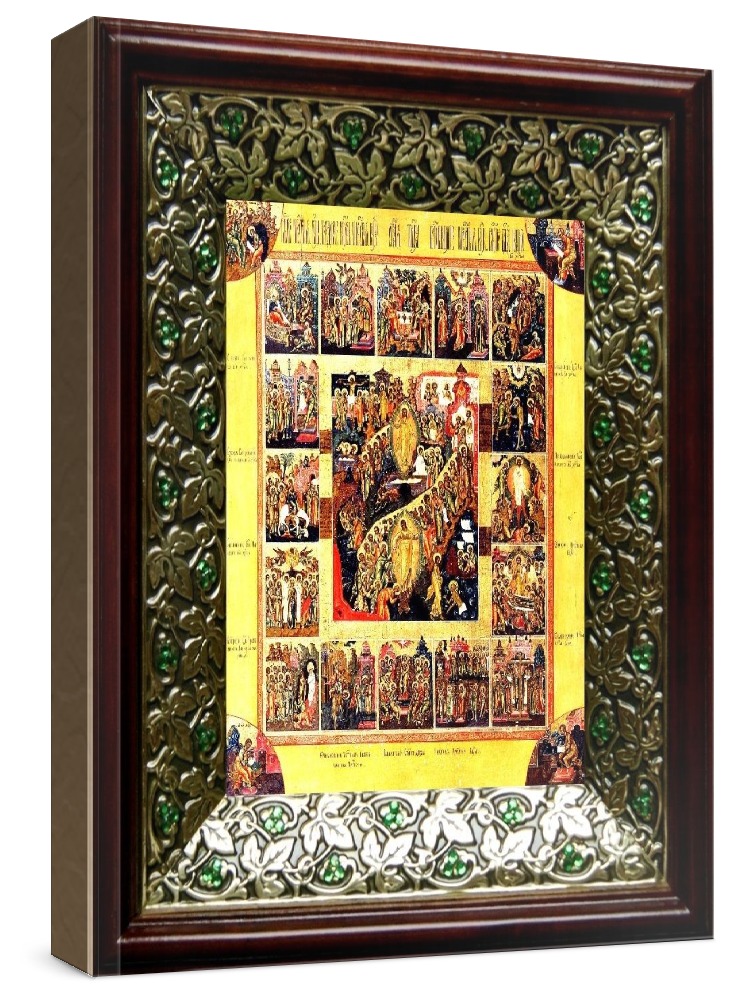 Икона воскресение христово с праздниками (21х24), киот со стразами. Лик нанесен методом шелкографии на цельную липовую доску, покрытую левкасом (специальным грунтом под живопись). Использованы минеральные (природные) краски. Размер иконы без киота (см): 13х16, с киотом: 21х24. Киот со стеклом, выполнен из березы и украшен басмой со стразами (узор из черненой меди в виде лозы). Икона освящена.