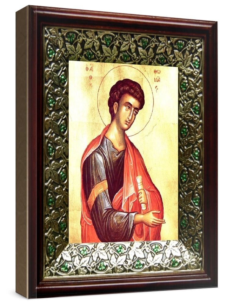 Икона фома, апостол (21х24), киот со стразами. Лик нанесен методом шелкографии на цельную липовую доску, покрытую левкасом (специальным грунтом под живопись). Использованы минеральные (природные) краски. Размер иконы без киота (см): 13х16, с киотом: 21х24. Киот со стеклом, выполнен из березы и украшен басмой со стразами (узор из черненой меди в виде лозы). Икона освящена.