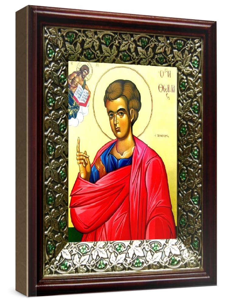 Икона фома, апостол (21х24), киот со стразами. Лик нанесен методом шелкографии на цельную липовую доску, покрытую левкасом (специальным грунтом под живопись). Использованы минеральные (природные) краски. Размер иконы без киота (см): 13х16, с киотом: 21х24. Киот со стеклом, выполнен из березы и украшен басмой со стразами (узор из черненой меди в виде лозы). Икона освящена.