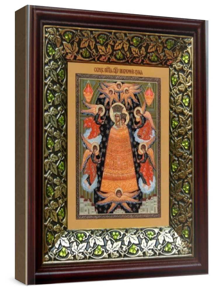 Икона прибавление ума (21х24), киот со стразами. Лик нанесен методом шелкографии на цельную липовую доску, покрытую левкасом (специальным грунтом под живопись). Использованы минеральные (природные) краски. Размер иконы без киота (см): 13х16, с киотом: 21х24. Киот (рамка) выполнен из березы и украшен басмой со стразами (узор из черненой меди в виде виноградной лозы). Икона освящена.