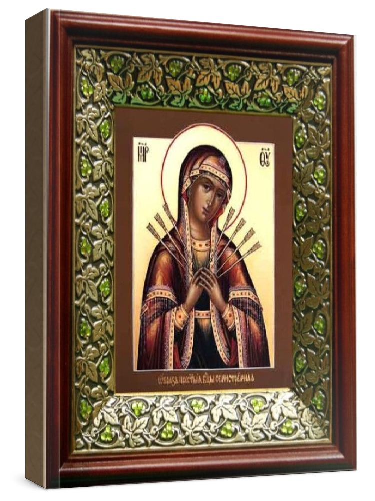 Лик нанесен методом шелкографии на цельную липовую доску, покрытую левкасом (специальным грунтом под живопись). Использованы минеральные (природные) краски. Размер иконы без киота (см): 13х16, с киотом: 21х24. Киот (рамка) выполнен из березы и украшен басмой со стразами (узор из черненой меди в виде виноградной лозы). Икона освящена.
