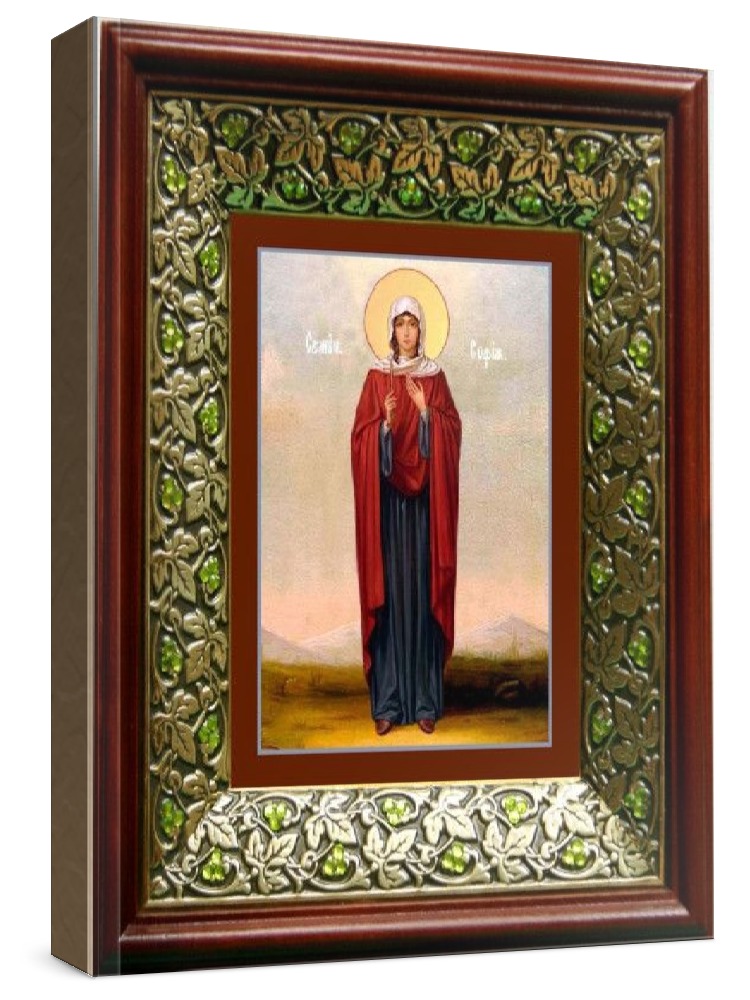 Икона софия римская (21х24), киот со стразами. Лик нанесен методом шелкографии на цельную липовую доску, покрытую левкасом (специальным грунтом под живопись). Использованы минеральные (природные) краски. Размер иконы без киота (см): 13х16, с киотом: 21х24. Киот (рамка) выполнен из березы и украшен басмой со стразами (узор из черненой меди в виде виноградной лозы). Икона освящена.