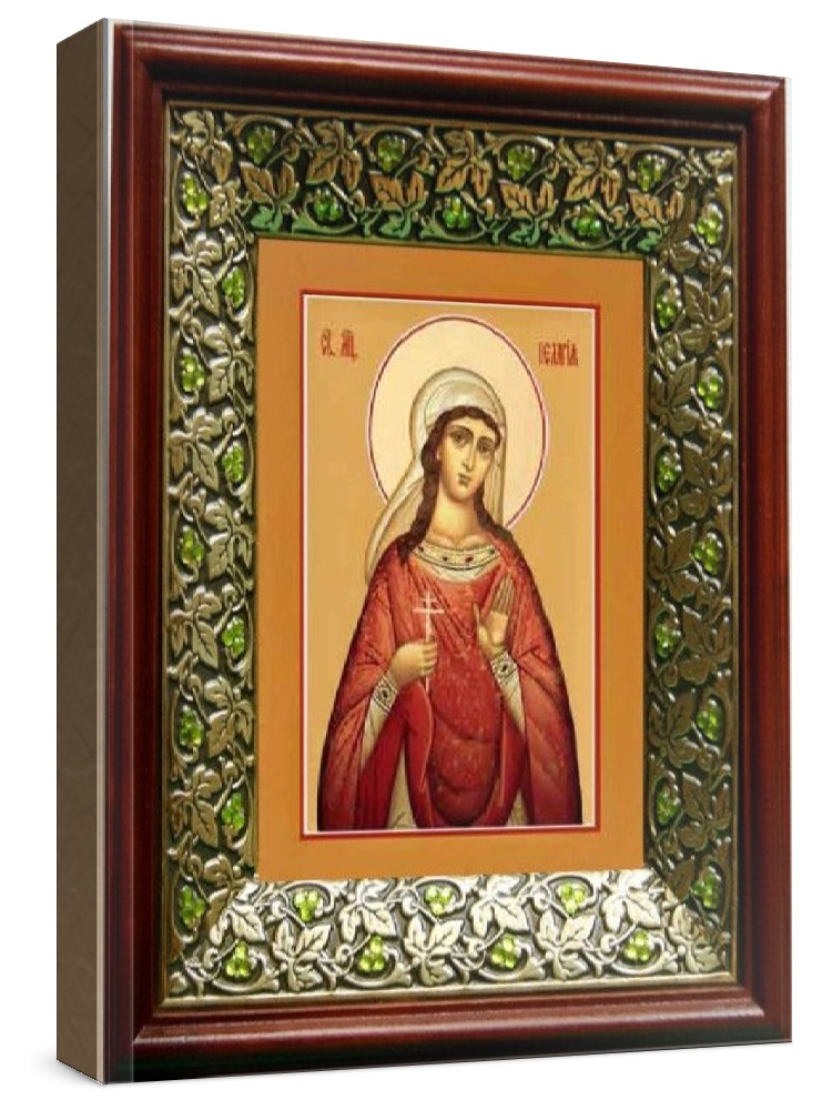 Икона пелагея тарсийская (21х24), киот со стразами. Лик нанесен методом шелкографии на цельную липовую доску, покрытую левкасом (специальным грунтом под живопись). Использованы минеральные (природные) краски. Размер иконы без киота (см): 13х16, с киотом: 21х24. Киот (рамка) выполнен из березы и украшен басмой со стразами (узор из черненой меди в виде виноградной лозы). Икона освящена.