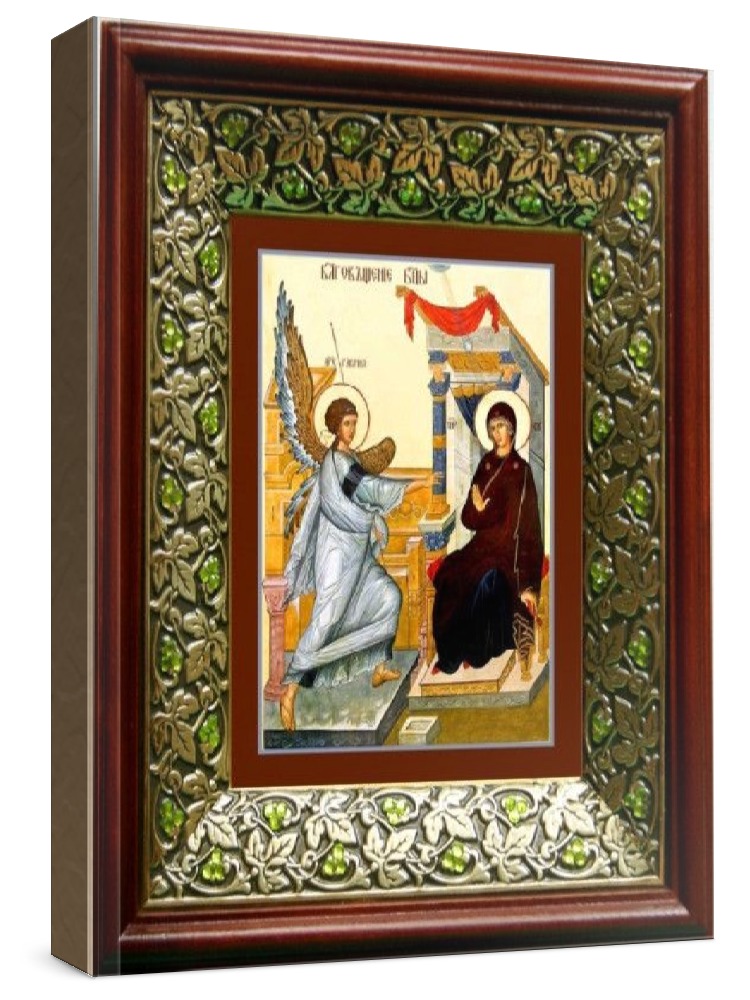 Икона благовещение пресвятой богородицы (21х24), киот со стразами. Лик нанесен методом шелкографии на цельную липовую доску, покрытую левкасом (специальным грунтом под живопись). Использованы минеральные (природные) краски. Размер иконы без киота (см): 13х16, с киотом: 21х24. Киот (рамка) выполнен из березы и украшен басмой со стразами (узор из черненой меди в виде виноградной лозы). Икона освящена.