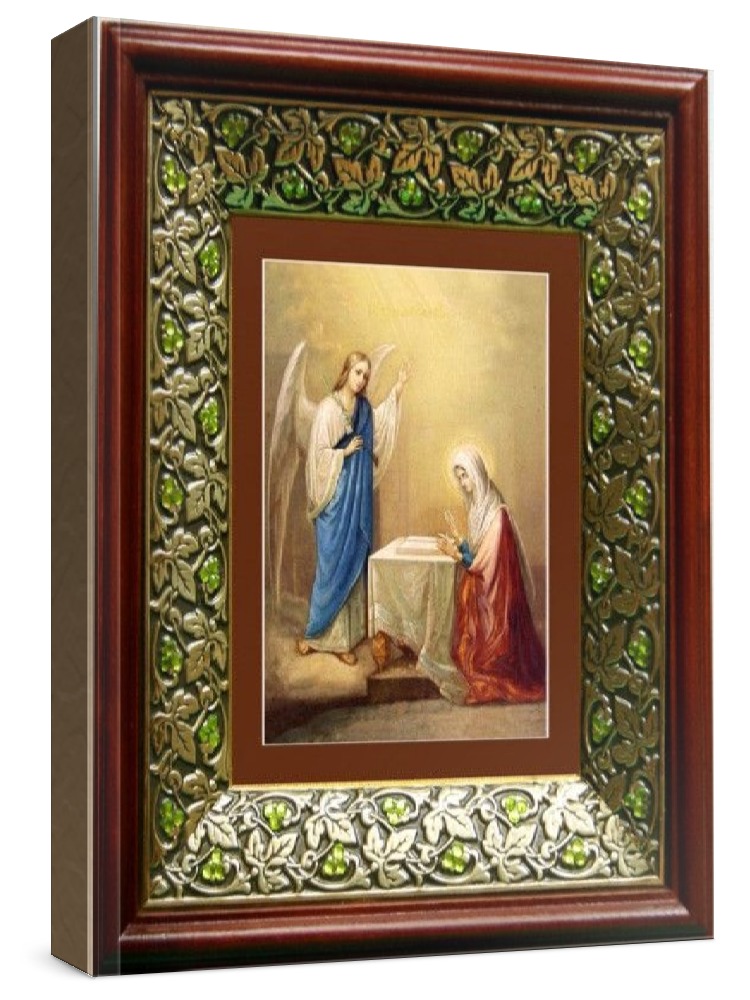 Икона благовещение пресвятой богородицы (21х24), киот со стразами. Лик нанесен методом шелкографии на цельную липовую доску, покрытую левкасом (специальным грунтом под живопись). Использованы минеральные (природные) краски. Размер иконы без киота (см): 13х16, с киотом: 21х24. Киот (рамка) выполнен из березы и украшен басмой со стразами (узор из черненой меди в виде виноградной лозы). Икона освящена.