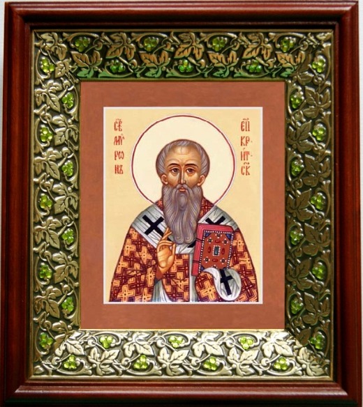 Икона мирон критский (21х24), киот со стразами. Лик нанесен методом шелкографии на цельную липовую доску, покрытую левкасом (специальным грунтом под живопись). Использованы минеральные (природные) краски. Размер иконы без киота (см): 13х16, с киотом: 21х24. Киот (рамка) выполнен из березы и украшен басмой со стразами (узор из черненой меди в виде виноградной лозы). Икона освящена.