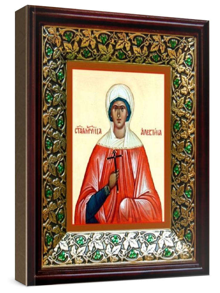 Икона алевтина кесарийская (21х24), киот со стразами. Лик нанесен методом шелкографии на цельную липовую доску, покрытую левкасом (специальным грунтом под живопись). Использованы минеральные (природные) краски. Размер иконы без киота (см): 13х16, с киотом: 21х24. Киот (рамка) выполнен из березы и украшен басмой со стразами (узор из черненой меди в виде виноградной лозы). Икона освящена.