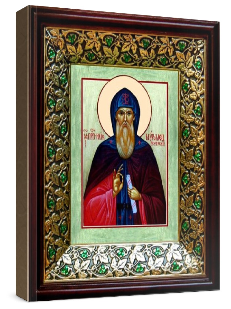 Икона илия муромец (21х24), киот со стразами. Лик нанесен методом шелкографии на цельную липовую доску, покрытую левкасом (специальным грунтом под живопись). Использованы минеральные (природные) краски. Размер иконы без киота (см): 13х16, с киотом: 21х24. Киот (рамка) выполнен из березы и украшен басмой со стразами (узор из черненой меди в виде виноградной лозы). Икона освящена.