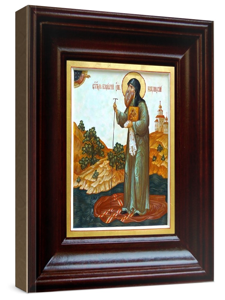 Икона василий рязанский (21х24), простой киот. Икона выполняется на заказ. Срок изготовления - 5-10 дней. Лик нанесен методом шелкографии на цельную липовую доску, покрытую левкасом (специальным грунтом под живопись). Использованы минеральные (природные) краски. Размер иконы без киота (см): 13х16, с киотом: 21х24. Киот (рамка) выполнен из березы. Икона освящена.