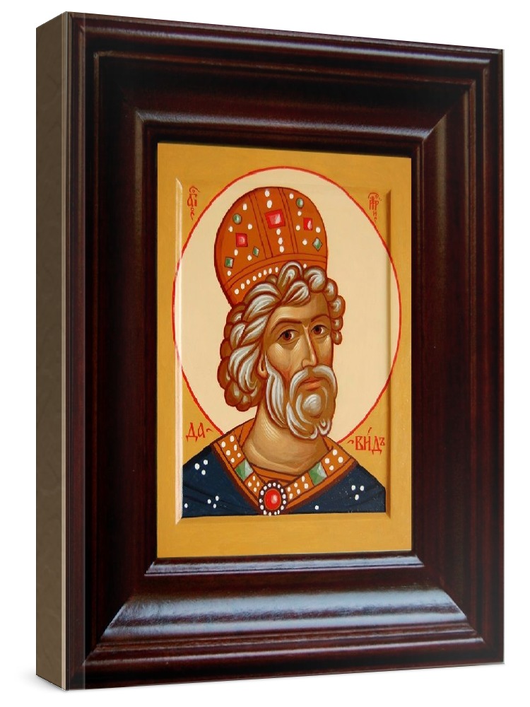 Икона давид, царь (21х24), простой киот. Икона выполняется на заказ. Срок изготовления - 5-10 дней. Лик нанесен методом шелкографии на цельную липовую доску, покрытую левкасом (специальным грунтом под живопись). Использованы минеральные (природные) краски. Размер иконы без киота (см): 13х16, с киотом: 21х24. Киот (рамка) выполнен из березы. Икона освящена.