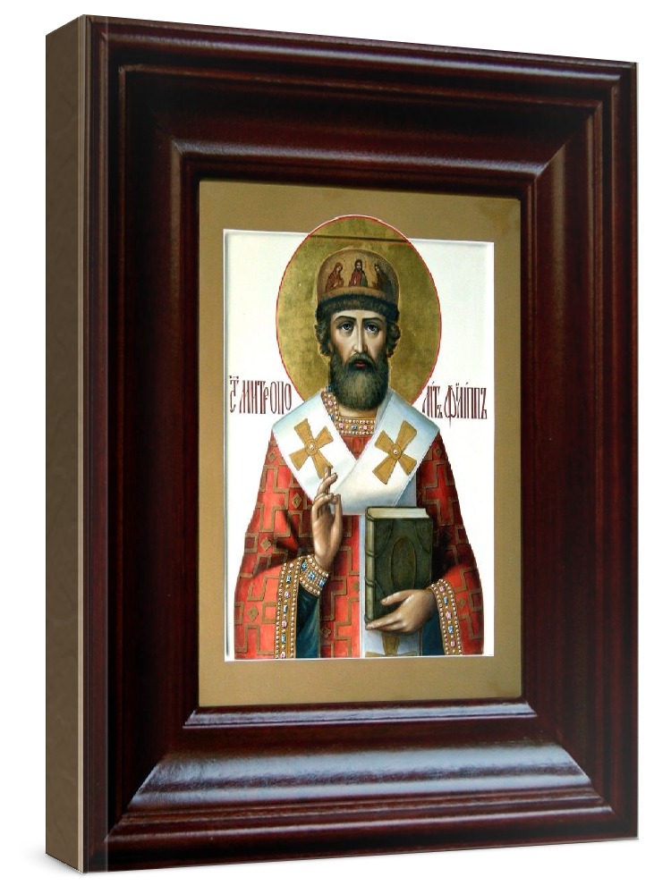 Икона филипп московский (21х24), простой киот. Икона выполняется на заказ. Срок изготовления - 5-10 дней. Лик нанесен методом шелкографии на цельную липовую доску, покрытую левкасом (специальным грунтом под живопись). Использованы минеральные (природные) краски. Размер иконы без киота (см): 13х16, с киотом: 21х24. Киот (рамка) выполнен из березы. Икона освящена.
