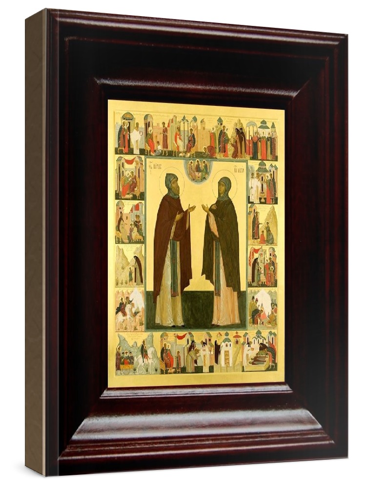 Икона кирилл и мария радонежские (21х24), простой киот. Икона выполняется на заказ. Срок изготовления - 5-10 дней. Лик нанесен методом шелкографии на цельную липовую доску, покрытую левкасом (специальным грунтом под живопись). Использованы минеральные (природные) краски. Размер иконы без киота (см): 13х16, с киотом: 21х24. Киот (рамка) выполнен из березы. Икона освящена.