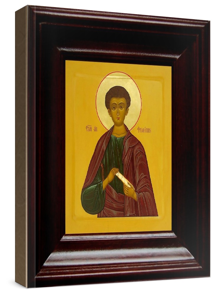 Икона филипп, апостол (21х24), простой киот. Икона выполняется на заказ. Срок изготовления - 5-10 дней. Лик нанесен методом шелкографии на цельную липовую доску, покрытую левкасом (специальным грунтом под живопись). Использованы минеральные (природные) краски. Размер иконы без киота (см): 13х16, с киотом: 21х24. Киот (рамка) выполнен из березы. Икона освящена.