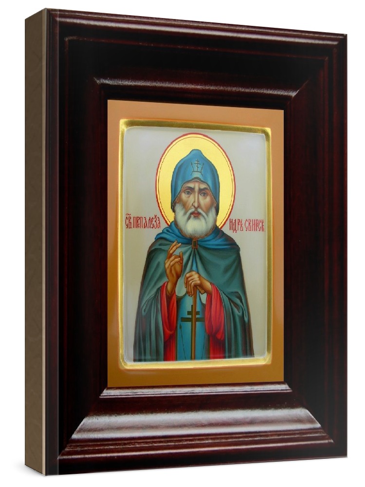 Икона александр свирский (21х24), простой киот. Икона выполняется на заказ. Срок изготовления - 3-7 дней. Лик нанесен методом шелкографии на цельную липовую доску, покрытую левкасом (специальным грунтом под живопись). Использованы минеральные (природные) краски. Размер иконы без киота (см): 13х16, с киотом: 21х24. Киот (рамка) выполнен из березы. Икона освящена.