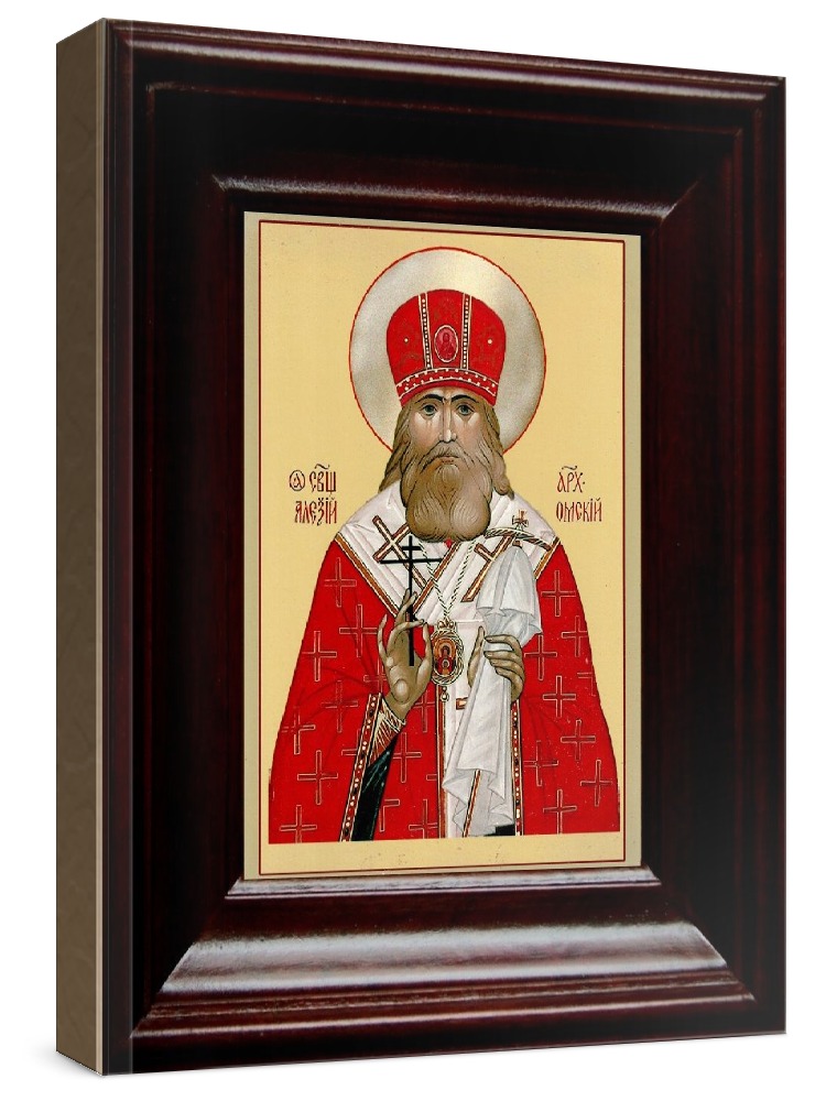 Икона алексий омский (21х24), простой киот. Икона выполняется на заказ. Срок изготовления - 3-7 дней. Лик нанесен методом шелкографии на цельную липовую доску, покрытую левкасом (специальным грунтом под живопись). Использованы минеральные (природные) краски. Размер иконы без киота (см): 13х16, с киотом: 21х24. Киот (рамка) выполнен из березы. Икона освящена.