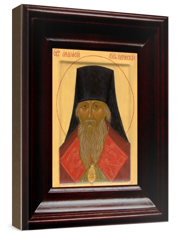 Икона афанасий ковровский (21х24), простой киот. Икона выполняется на заказ. Срок изготовления - 3-7 дней. Лик нанесен методом шелкографии на цельную липовую доску, покрытую левкасом (специальным грунтом под живопись). Использованы минеральные (природные) краски. Размер иконы без киота (см): 13х16, с киотом: 21х24. Киот (рамка) выполнен из березы. Икона освящена.