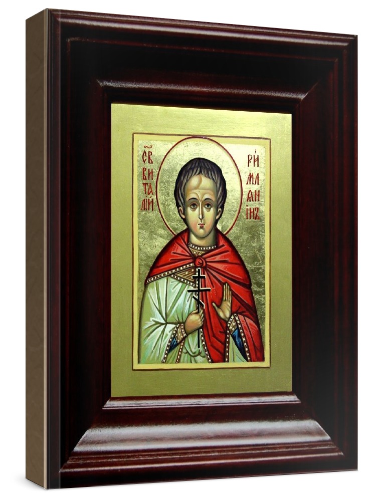 Икона виталий римлянин (21х24), простой киот. Икона выполняется на заказ. Срок изготовления - 3-7 дней. Лик нанесен методом шелкографии на цельную липовую доску, покрытую левкасом (специальным грунтом под живопись). Использованы минеральные (природные) краски. Размер иконы без киота (см): 13х16, с киотом: 21х24. Киот (рамка) выполнен из березы. Икона освящена.
