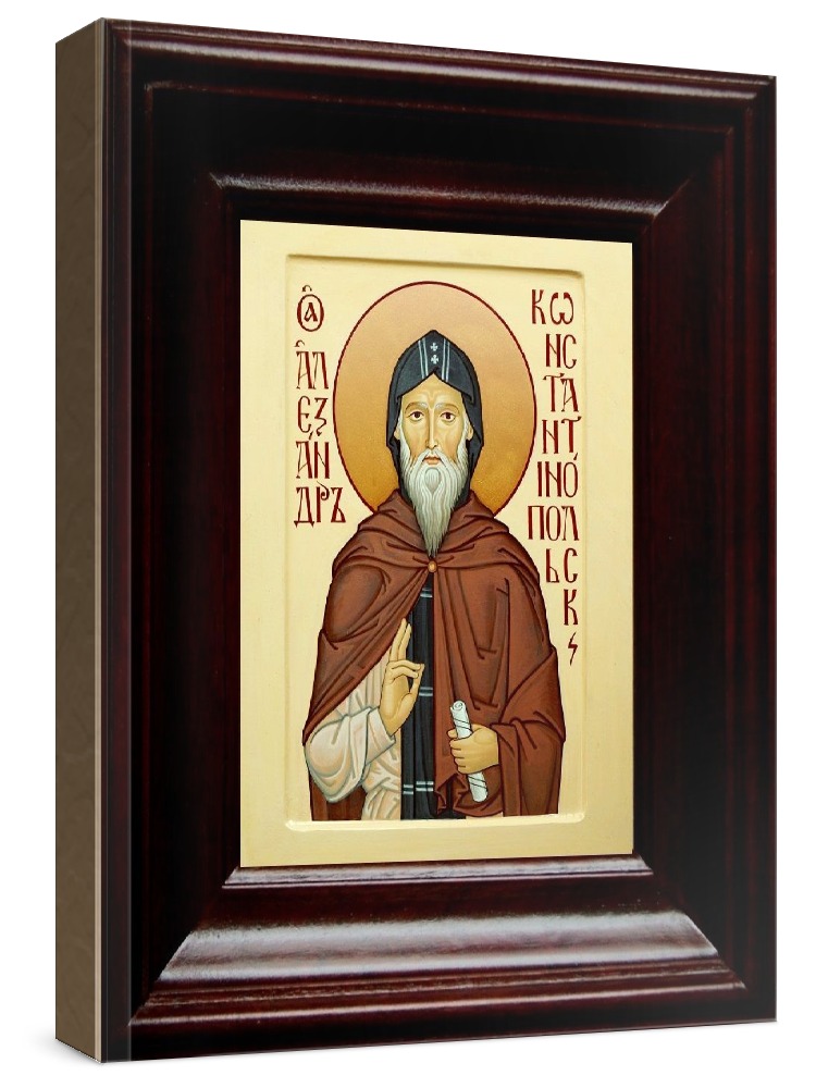 Икона александр константинопольский (21х24), простой киот. Икона выполняется на заказ. Срок изготовления - 3-7 дней. Лик нанесен методом шелкографии на цельную липовую доску, покрытую левкасом (специальным грунтом под живопись). Использованы минеральные (природные) краски. Размер иконы без киота (см): 13х16, с киотом: 21х24. Киот (рамка) выполнен из березы. Икона освящена.