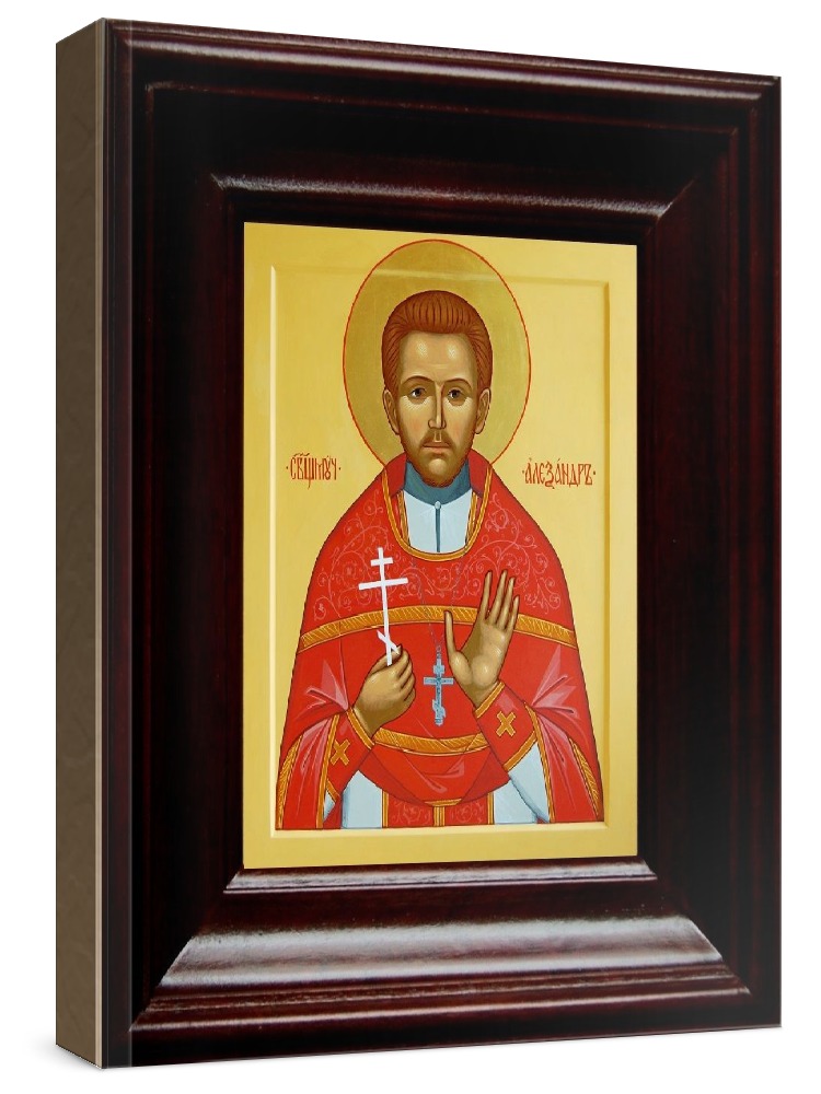 Икона александр цицеронов (21х24), простой киот. Икона выполняется на заказ. Срок изготовления - 3-7 дней. Лик нанесен методом шелкографии на цельную липовую доску, покрытую левкасом (специальным грунтом под живопись). Использованы минеральные (природные) краски. Размер иконы без киота (см): 13х16, с киотом: 21х24. Киот (рамка) выполнен из березы. Икона освящена.