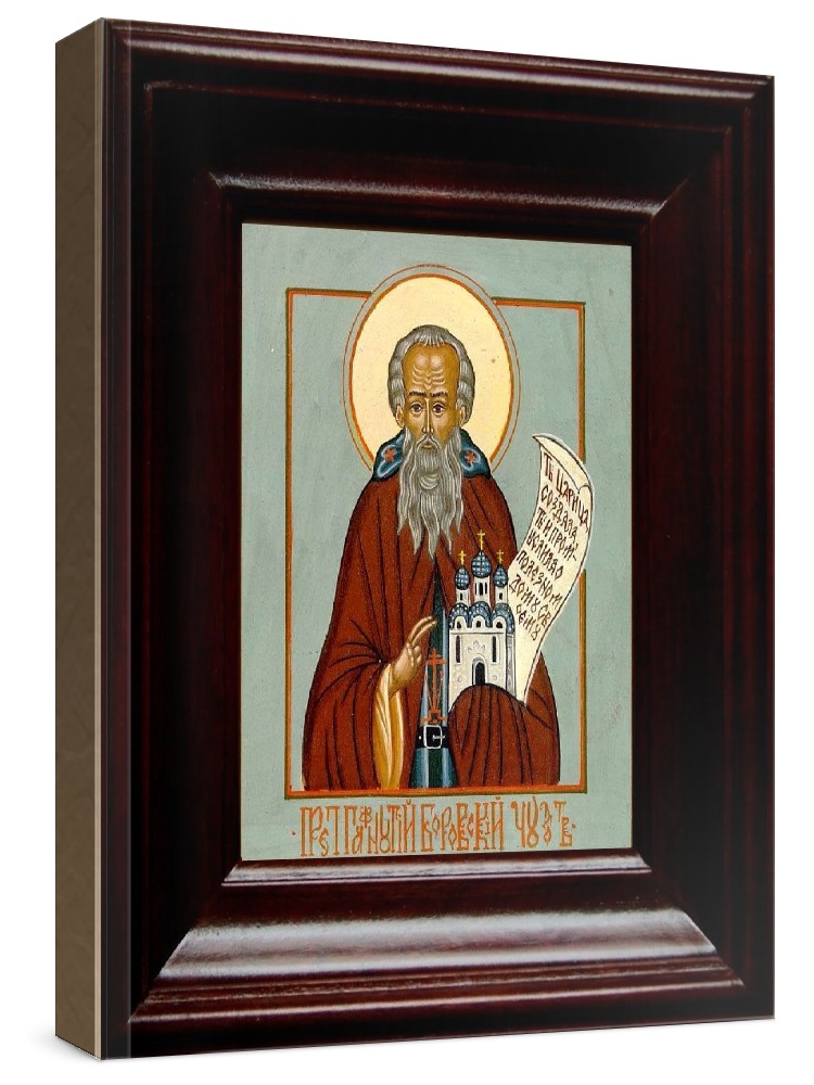 Икона пафнутий боровский (21х24), простой киот. Икона выполняется на заказ. Срок изготовления - 3-7 дней. Лик нанесен методом шелкографии на цельную липовую доску, покрытую левкасом (специальным грунтом под живопись). Использованы минеральные (природные) краски. Размер иконы без киота (см): 13х16, с киотом: 21х24. Киот (рамка) выполнен из березы. Икона освящена.