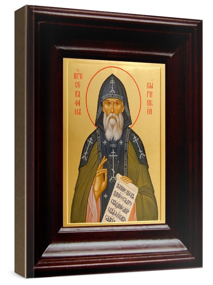 Икона серафим вырицкий (21х24), простой киот. Икона выполняется на заказ. Срок изготовления - 3-7 дней. Лик нанесен методом шелкографии на цельную липовую доску, покрытую левкасом (специальным грунтом под живопись). Использованы минеральные (природные) краски. Размер иконы без киота (см): 13х16, с киотом: 21х24. Киот (рамка) выполнен из березы. Икона освящена.