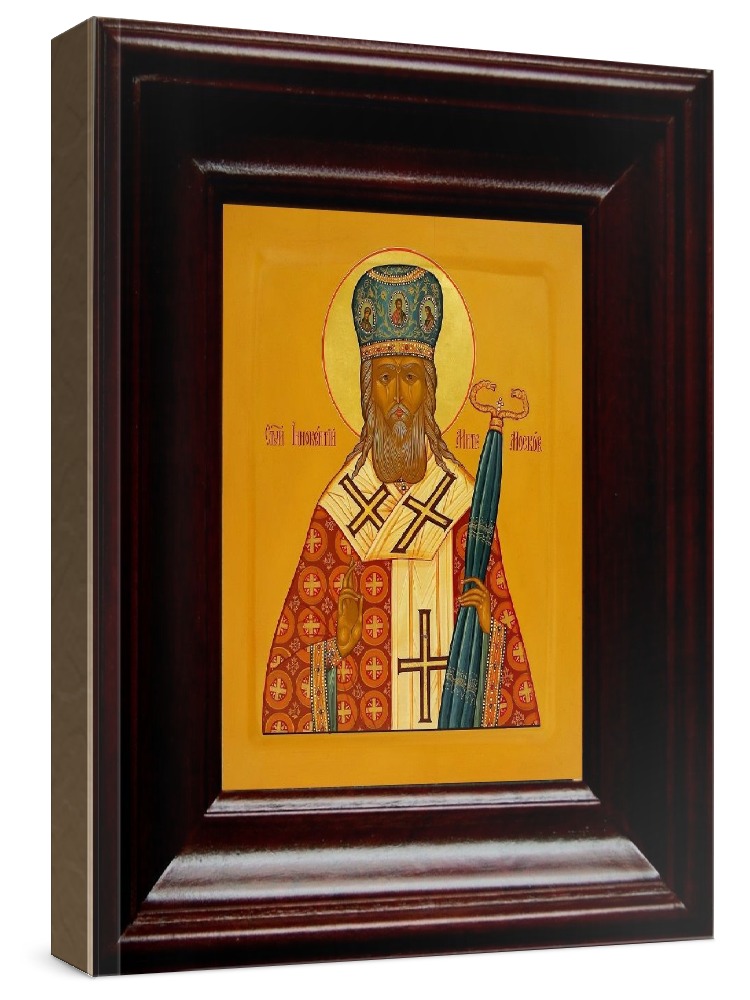 Икона иннокентий московский (21х24), простой киот. Икона выполняется на заказ. Срок изготовления - 3-7 дней. Лик нанесен методом шелкографии на цельную липовую доску, покрытую левкасом (специальным грунтом под живопись). Использованы минеральные (природные) краски. Размер иконы без киота (см): 13х16, с киотом: 21х24. Киот (рамка) выполнен из березы. Икона освящена.