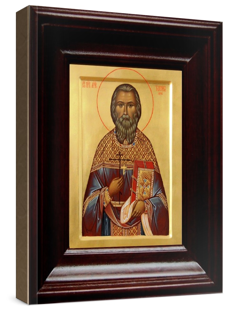 Икона тихон бузов (21х24), простой киот. Икона выполняется на заказ. Срок изготовления - 3-7 дней. Лик нанесен методом шелкографии на цельную липовую доску, покрытую левкасом (специальным грунтом под живопись). Использованы минеральные (природные) краски. Размер иконы без киота (см): 13х16, с киотом: 21х24. Киот (рамка) выполнен из березы. Икона освящена.