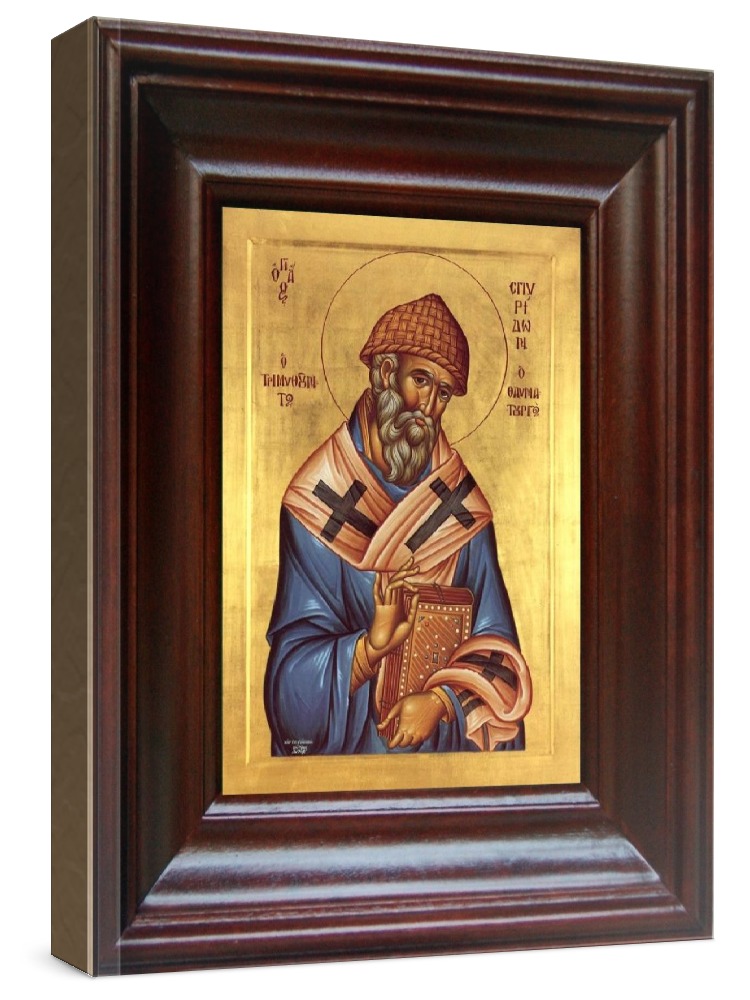 Икона спиридон тримифунтский (21х24), простой киот. Икона выполняется на заказ. Срок изготовления - 3-7 дней. Лик нанесен методом шелкографии на цельную липовую доску, покрытую левкасом (специальным грунтом под живопись). Использованы минеральные (природные) краски. Размер иконы без киота (см): 13х16, с киотом: 21х24. Киот (рамка) выполнен из березы. Икона освящена.