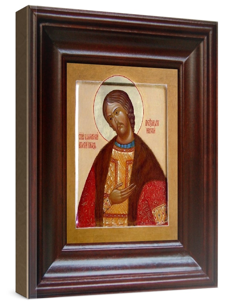Икона александр невский (21х24), простой киот. Икона выполняется на заказ. Срок изготовления - 3-7 дней. Лик нанесен методом шелкографии на цельную липовую доску, покрытую левкасом (специальным грунтом под живопись). Использованы минеральные (природные) краски. Размер иконы без киота (см): 13х16, с киотом: 21х24. Киот (рамка) выполнен из березы. Икона освящена.