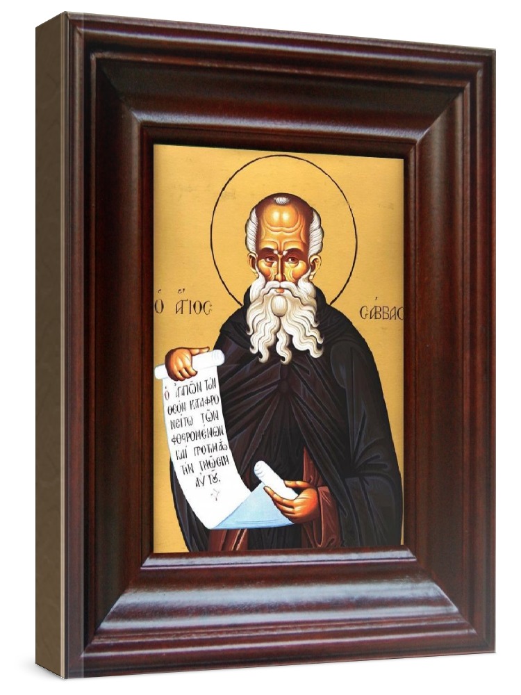 Икона савва освященный (21х24), простой киот. Икона выполняется на заказ. Срок изготовления - 2-5 дней. Лик нанесен методом шелкографии на цельную липовую доску, покрытую левкасом (специальным грунтом под живопись). Использованы минеральные (природные) краски. Размер иконы без киота (см): 13х16, с киотом: 21х24. Киот (рамка) выполнен из березы. Икона освящена.