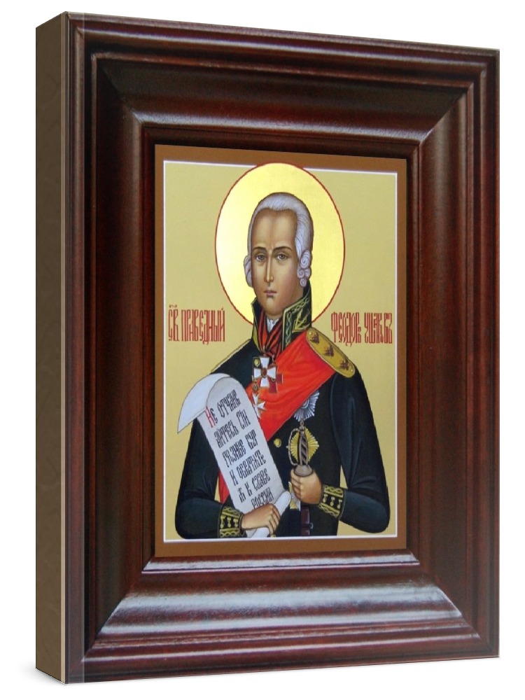 Икона феодор ушаков (21х24), простой киот. Икона выполняется на заказ. Срок изготовления - 2-5 дней. Лик нанесен методом шелкографии на цельную липовую доску, покрытую левкасом (специальным грунтом под живопись). Использованы минеральные (природные) краски. Размер иконы без киота (см): 13х16, с киотом: 21х24. Киот (рамка) выполнен из березы. Икона освящена.