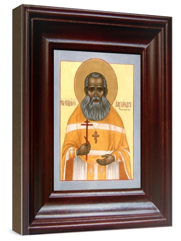 Икона александр телемаков (21х24), простой киот. Икона выполняется на заказ. Срок изготовления - 2-5 дней. Лик нанесен методом шелкографии на цельную липовую доску, покрытую левкасом (специальным грунтом под живопись). Использованы минеральные (природные) краски. Размер иконы без киота (см): 13х16, с киотом: 21х24. Киот (рамка) выполнен из березы. Икона освящена.
