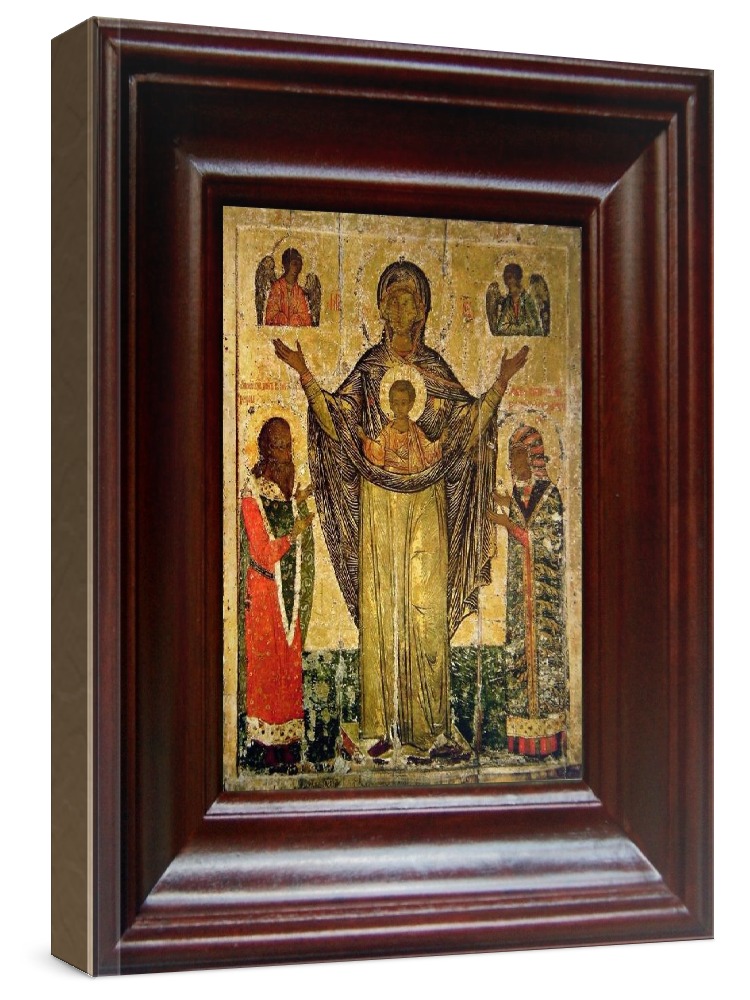 Мирожская икона бм (21х24), простой киот. Икона выполняется на заказ. Срок изготовления - 2-5 дней. Лик нанесен методом шелкографии на цельную липовую доску, покрытую левкасом (специальным грунтом под живопись). Использованы минеральные (природные) краски. Размер иконы без киота (см): 13х16, с киотом: 21х24. Киот (рамка) выполнен из березы. Икона освящена.