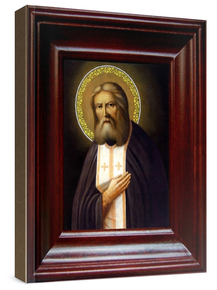 Икона серафим саровский (21х24), простой киот. Икона выполняется на заказ. Срок изготовления - 2-5 дней. Лик нанесен методом шелкографии на цельную липовую доску, покрытую левкасом (специальным грунтом под живопись). Использованы минеральные (природные) краски. Размер иконы без киота (см): 13х16, с киотом: 21х24. Киот (рамка) выполнен из березы. Икона освящена.