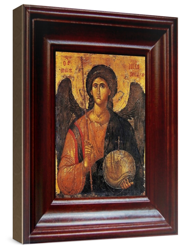 Икона михаил архангел (21х24), простой киот. Икона выполняется на заказ. Срок изготовления - 2-5 дней. Лик нанесен методом шелкографии на цельную липовую доску, покрытую левкасом (специальным грунтом под живопись). Использованы минеральные (природные) краски. Размер иконы без киота (см): 13х16, с киотом: 21х24. Киот (рамка) выполнен из березы. Икона освящена.