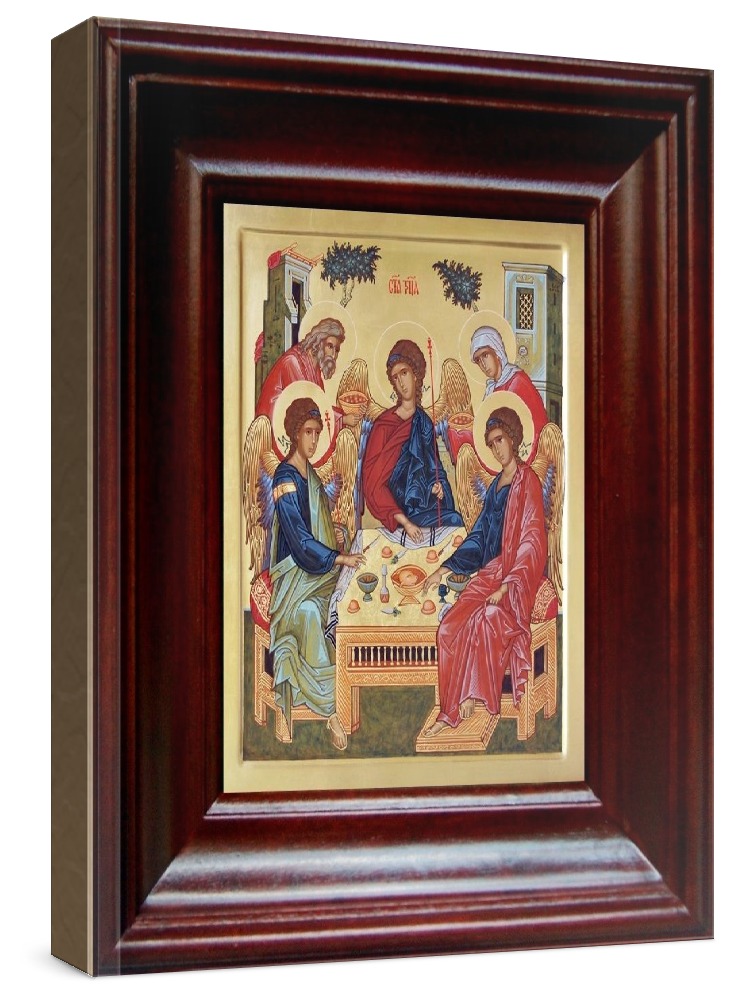 Икона троица (21х24), простой киот. Икона выполняется на заказ. Срок изготовления - 2-5 дней. Лик нанесен методом шелкографии на цельную липовую доску, покрытую левкасом (специальным грунтом под живопись). Использованы минеральные (природные) краски. Размер иконы без киота (см): 13х16, с киотом: 21х24. Киот (рамка) выполнен из березы. Икона освящена.