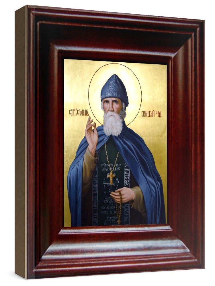 Икона серафим вырицкий (21х24), простой киот. Икона выполняется на заказ. Срок изготовления - 2-5 дней. Лик нанесен методом шелкографии на цельную липовую доску, покрытую левкасом (специальным грунтом под живопись). Использованы минеральные (природные) краски. Размер иконы без киота (см): 13х16, с киотом: 21х24. Киот (рамка) выполнен из березы. Икона освящена.