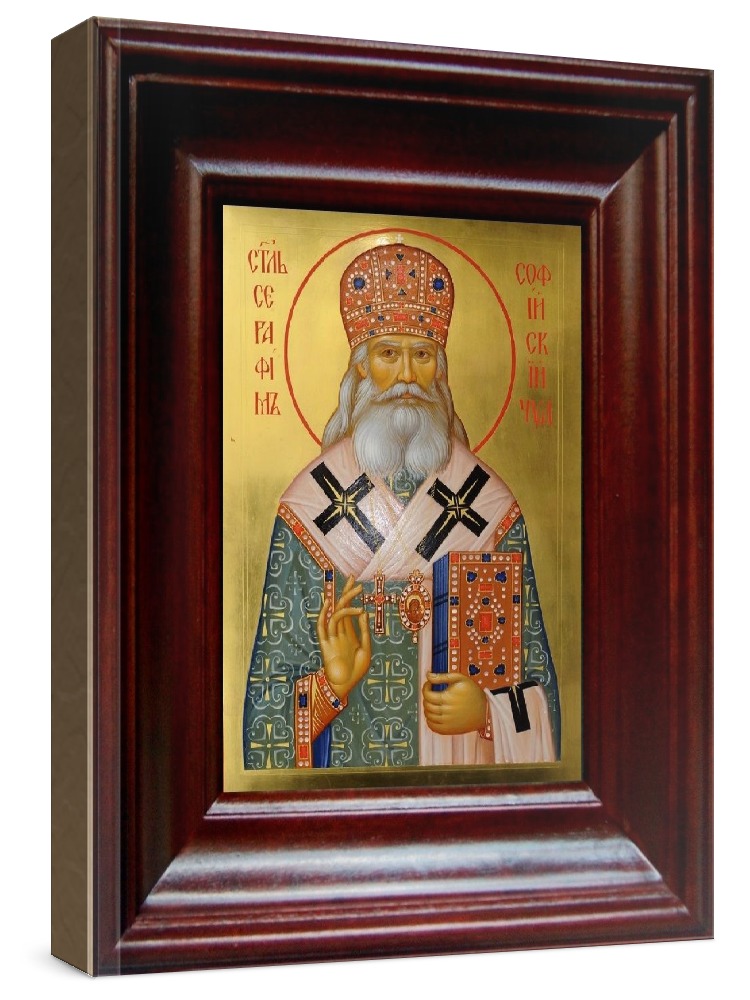 Икона серафим соболев (21х24), простой киот. Икона выполняется на заказ. Срок изготовления - 2-5 дней. Лик нанесен методом шелкографии на цельную липовую доску, покрытую левкасом (специальным грунтом под живопись). Использованы минеральные (природные) краски. Размер иконы без киота (см): 13х16, с киотом: 21х24. Киот (рамка) выполнен из березы. Икона освящена.