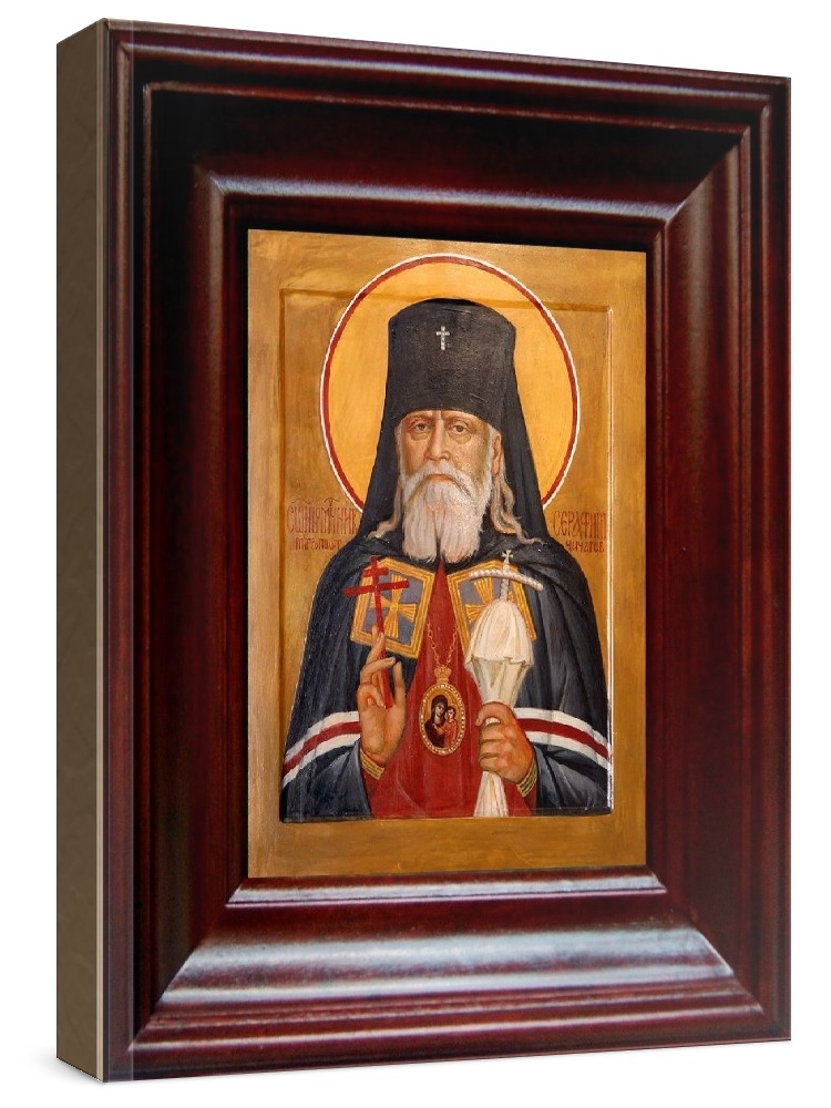 Икона серафим чичагов (21х24), простой киот. Икона выполняется на заказ. Срок изготовления - 2-5 дней. Лик нанесен методом шелкографии на цельную липовую доску, покрытую левкасом (специальным грунтом под живопись). Использованы минеральные (природные) краски. Размер иконы без киота (см): 13х16, с киотом: 21х24. Киот (рамка) выполнен из березы. Икона освящена.