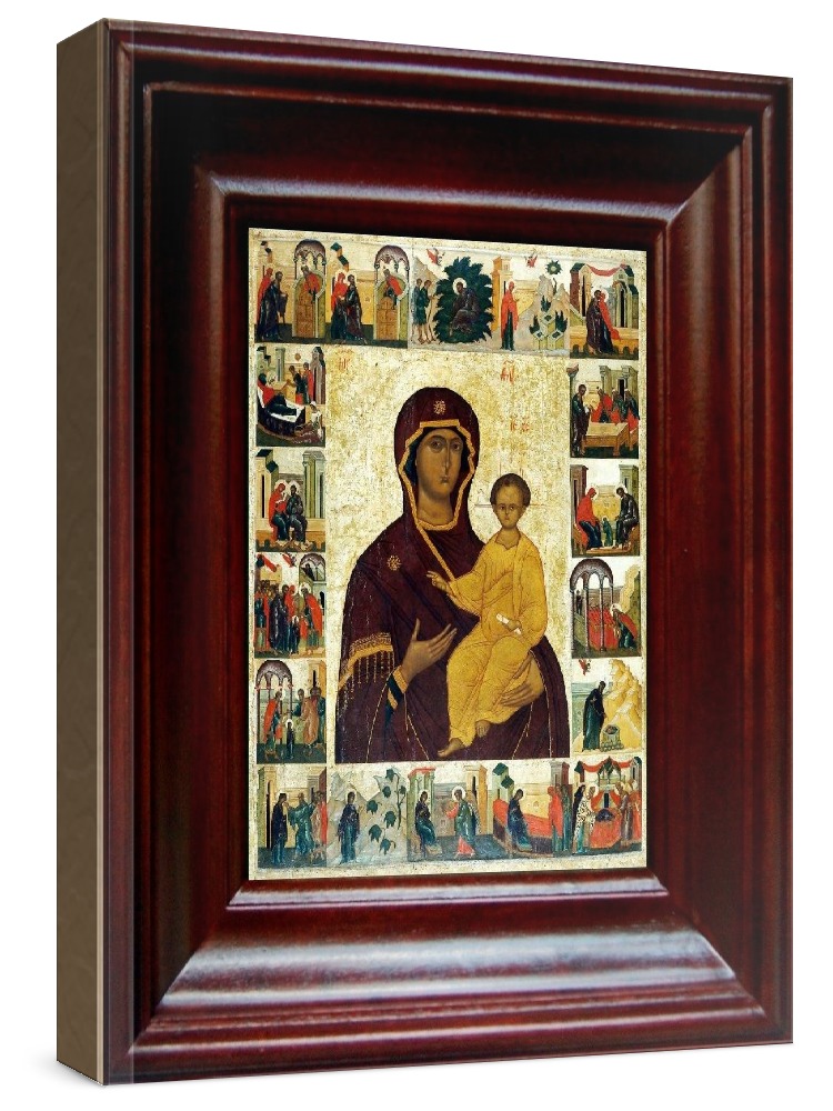 Смоленская икона бм (21х24), простой киот. Икона выполняется на заказ. Срок изготовления - 2-5 дней. Лик нанесен методом шелкографии на цельную липовую доску, покрытую левкасом (специальным грунтом под живопись). Использованы минеральные (природные) краски. Размер иконы без киота (см): 13х16, с киотом: 21х24. Киот (рамка) выполнен из березы. Икона освящена.