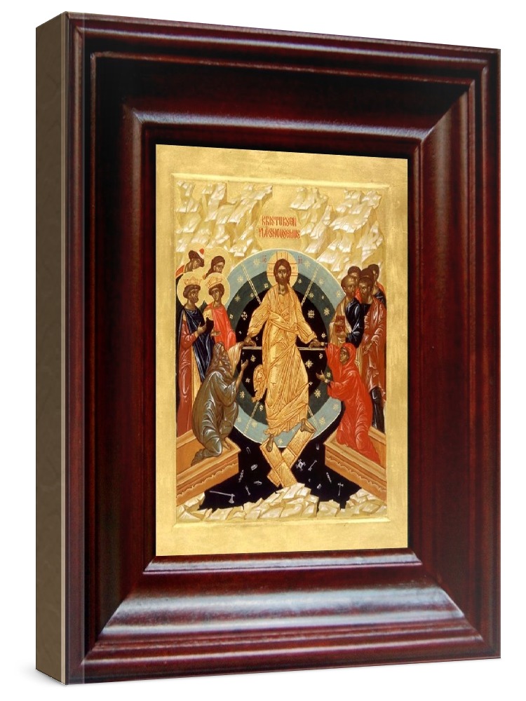 Икона воскресение христово (21х24), простой киот. Икона выполняется на заказ. Срок изготовления - 2-5 дней. Лик нанесен методом шелкографии на цельную липовую доску, покрытую левкасом (специальным грунтом под живопись). Использованы минеральные (природные) краски. Размер иконы без киота (см): 13х16, с киотом: 21х24. Киот (рамка) выполнен из березы. Икона освящена.