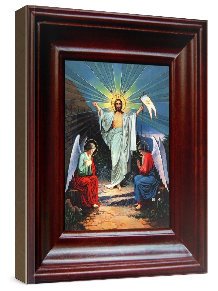 Икона воскресение христово (21х24), простой киот. Икона выполняется на заказ. Срок изготовления - 2-5 дней. Лик нанесен методом шелкографии на цельную липовую доску, покрытую левкасом (специальным грунтом под живопись). Использованы минеральные (природные) краски. Размер иконы без киота (см): 13х16, с киотом: 21х24. Киот (рамка) выполнен из березы. Икона освящена.