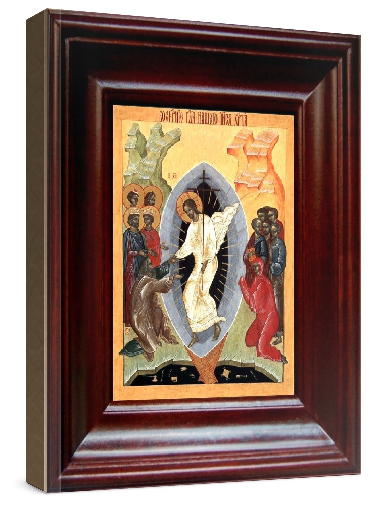 Икона воскресение христово (21х24), простой киот. Икона выполняется на заказ. Срок изготовления - 2-5 дней. Лик нанесен методом шелкографии на цельную липовую доску, покрытую левкасом (специальным грунтом под живопись). Использованы минеральные (природные) краски. Размер иконы без киота (см): 13х16, с киотом: 21х24. Киот (рамка) выполнен из березы. Икона освящена.