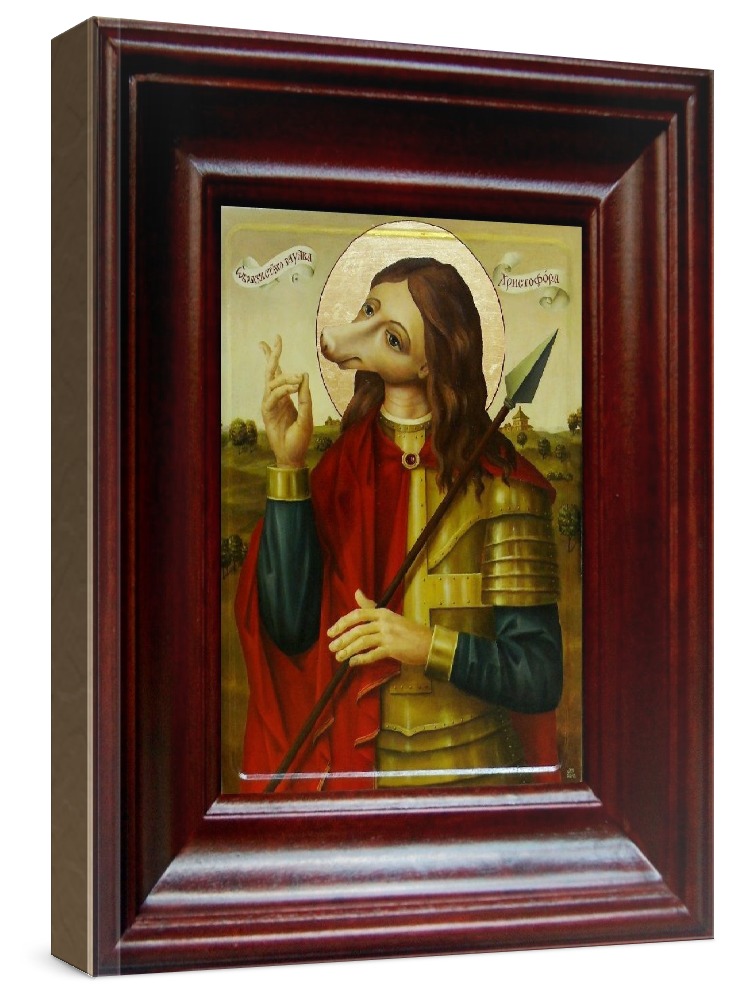 Икона христофор псеглавец (21х24), простой киот. Икона выполняется на заказ. Срок изготовления - 2-5 дней. Лик нанесен методом шелкографии на цельную липовую доску, покрытую левкасом (специальным грунтом под живопись). Использованы минеральные (природные) краски. Размер иконы без киота (см): 13х16, с киотом: 21х24. Киот (рамка) выполнен из березы. Икона освящена.